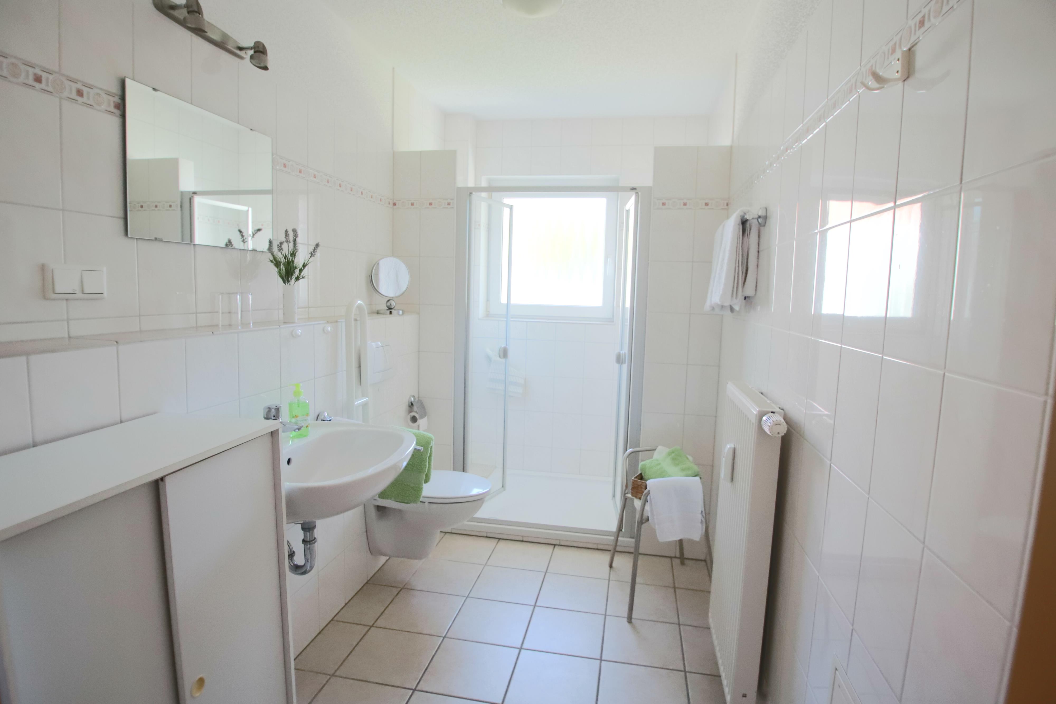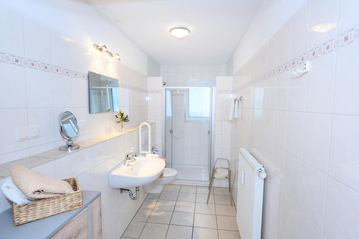 Im Tageslichtbad finden Sie neben einem Waschbecken u. WC( mit Haltegriff )eine große Dusche mit flachem Einstieg.