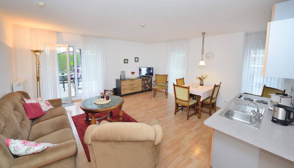 Der Wohn-Ess-Bereich umfasst eine Kitchnette mit (Kühl-Gefrierkombi, 2 Kochplatten, Spühlmaschine, Microwelle, Kaffemaschine, Wasserkocher u. Toaster), sowie Flachbild TV , Radio, kleiner Leseauswahl und Balkonzugang (Tritthöhe 18 cm) mit Blick in den Garten. Das Schlafzimmer ist mit einem Doppelbett ausgestattet.