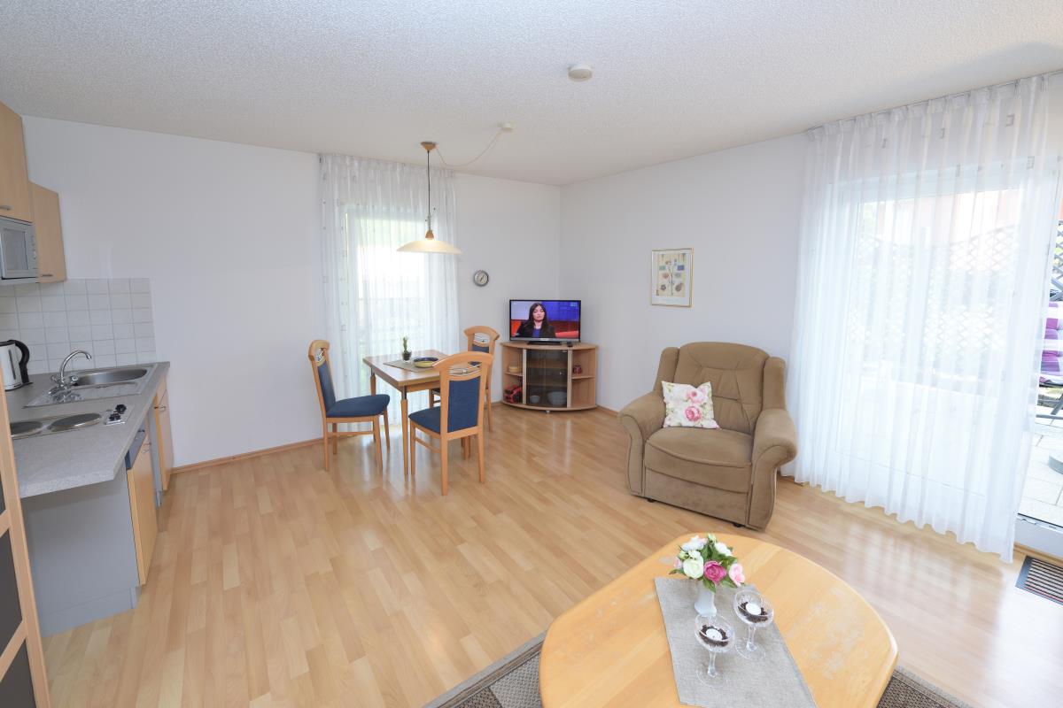 Der Wohn-Ess-Bereich umfasst eine Kitchnette (mit Kühl-Gefrierkombi, 2 Kochplatten, Microwelle,Kaffemaschine, Wasserkocher u. Toaster) sowie Flachbild TV, Radio, kleiner Leseauswahl und Balkonzugang(Tritthöhe 18cm) mit Blick ins Grüne. Das Schlafzimmer ist mit einem Doppelbett ausgestattet.