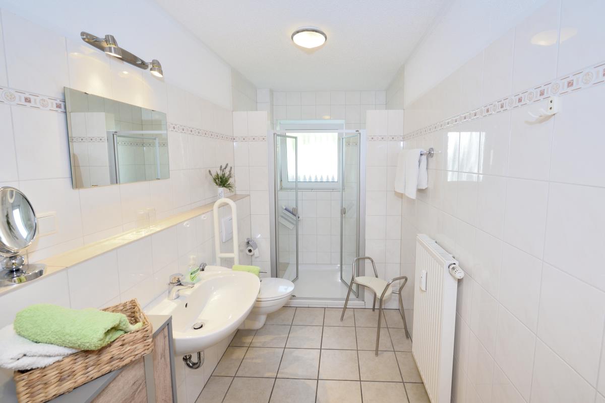 Im Tageslichtbad finden Sie neben einem Waschbecken und WC(mit Haltegriff) eine große Dusche mit flachem Einstieg.